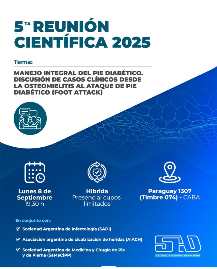 8 septiembre, 2025(1 event) – 5ta Reunión Científica 📖 Tema: Manejo integral del pie diabético. Discusión de casos clínicos desde la osteomielitis al ataque de pie diabético (foot attack) ⛓️💥Link a inscripción presencial: https://forms.gle/gx3o7TF8L7M8Ye118 ⛓️💥Link de conexión a zoom: https://us06web.zoom.us/j/88300975084