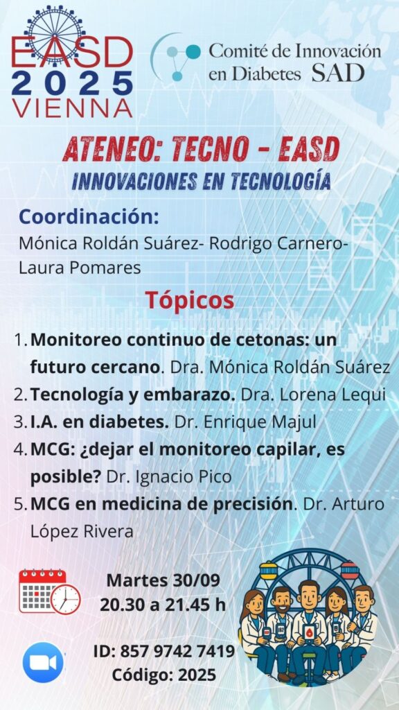 30 septiembre, 2025(1 event) – ATENEO DONDE SE TRATARAN TEMAS REELEVANTES RELACIONADOS A TECNOLOGÍA DESARROLLADOS EN EL CONGRESO EUROPEO DE DIABETES 2025 🎯Organiza: COMITE DE INNOVACION SAD